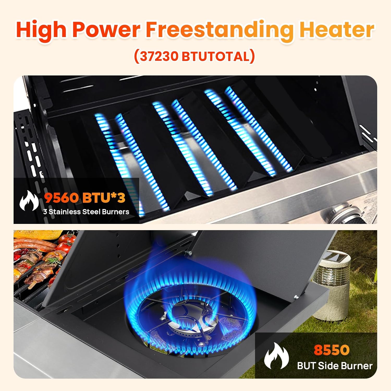 • 🔥 High-Performance Stainless Steel Burners - This propane gas grill features 3 powerful stainless steel burners and side burner delivering a total of 37,230 BTU per hour. With a built-in piezoelectric ignition system, you can enjoy instant start-up—just push and turn the control knob. It’s reliable, efficient, and ready to fire up your outdoor meals in seconds.