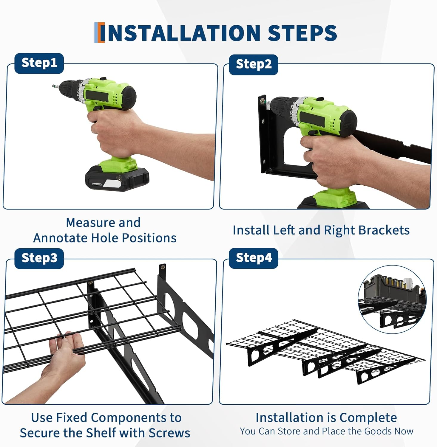 • 1,600 lbs load bearing: The garage storage shelf measures 72.05 x 24.8 x 12.01 inches (W x D x H) with a 0.5 foot arc height. Heavy-duty powder-coated steel garage storage racks are set to provide high-quality hardware for each component. It depends on the load bearing capacity of the wall and the installation environment. The maximum load is 800 pounds per piece, and if mounted on a wall post, measure the distance before buying.
