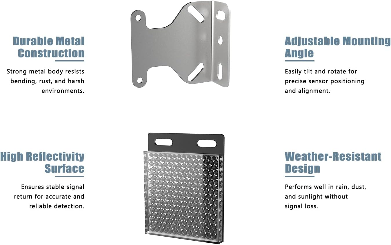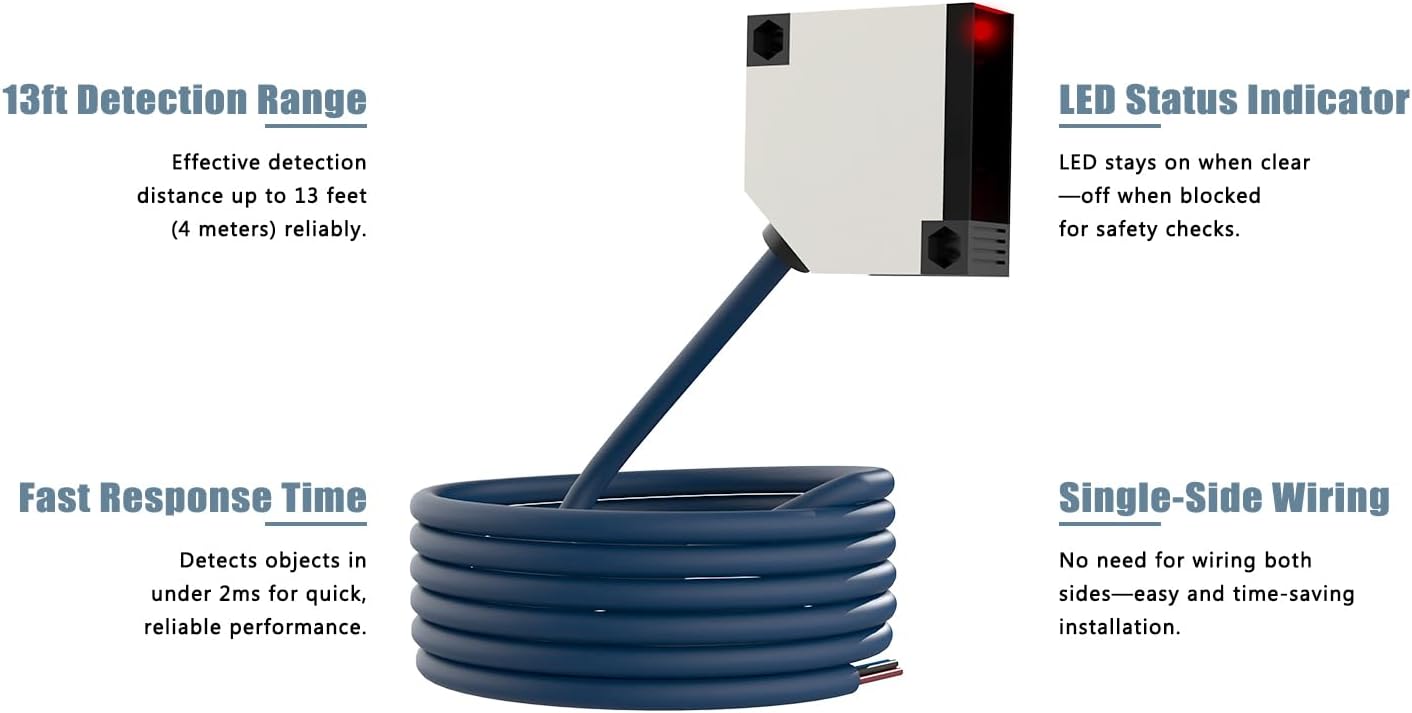 • 🛡️ Precision Safety with Photoelectric Beam Sensor — Wall-mounted retroreflective sensor detects objects up to 13ft away, stopping or reversing the gate instantly on obstruction. Designed for both indoor and outdoor use, with IP65 waterproof rating.