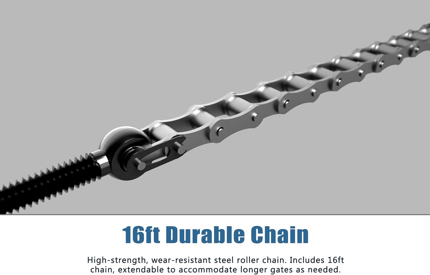 • ⚙️ Compact & Powerful Chain Drive — 130W motor powers sliding gates up to 1100lb with quiet and smooth performance. Comes with 16.4ft heavy-duty chain for easy installation and reliable operation.