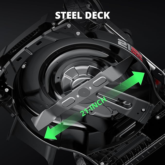 • DURABLE 21" STEEL DECK FOR FASTER RESULTS: The reinforced 21-inch steel cutting deck on this lawnmower is built to handle tough mowing jobs, delivering smooth, even cuts. It’s an excellent match for those who want to finish faster with a high-efficiency gas powered lawn mower