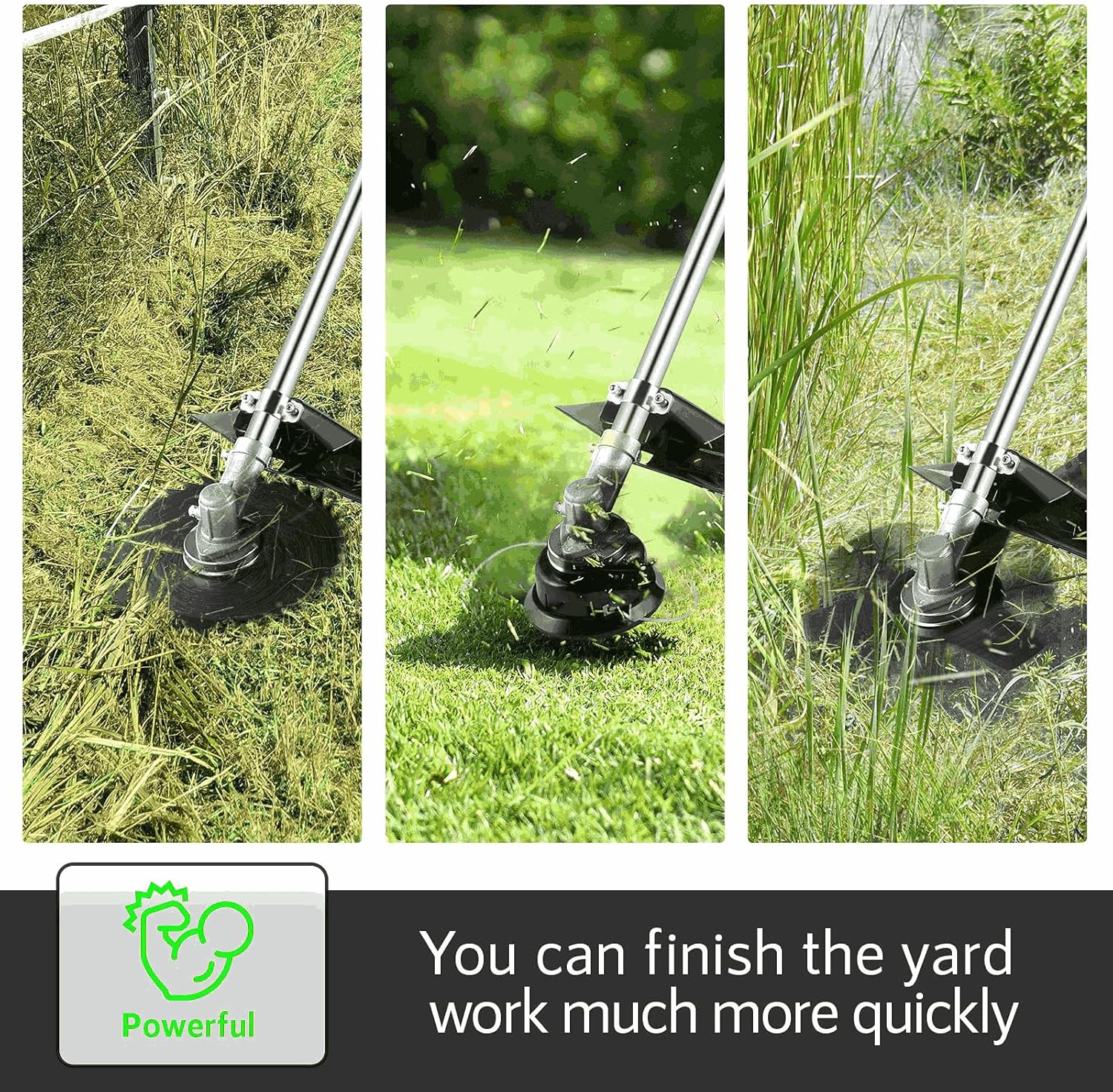 • 【4-In-1 Detachable Trimming Heads】Brush cutter equipped with 4 trimming heads, easily convert from 4T blade to 3T blade or dual thread head. 0.09" dual line head is intended to cut lawn & tender grass; 3T blade/saw blade brush cutter to power through weed and small shrub vegetation or withered grass, ect. A 10-inch cutting path can help quickly mowing bush, thicker shrub grass, sapling or vegetation.