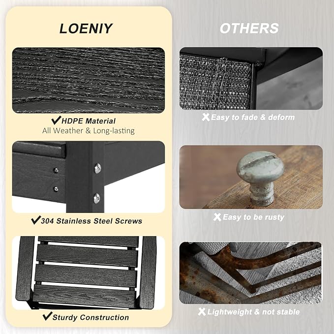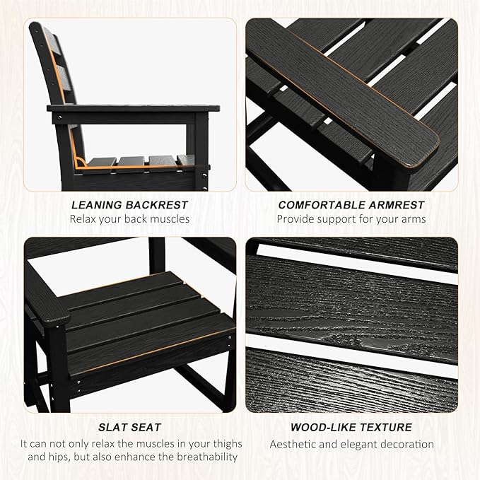 • 【All-Weather Material】Made of High-density polyethylene (HDPE) and 304 stainless steel hardware, this patio dining set is long-lasting and will not crack, scratch, rust, or fade over time. In addition, the table and chairs are designed with an elegant wood-like texture, combining both practicality and aesthetics.