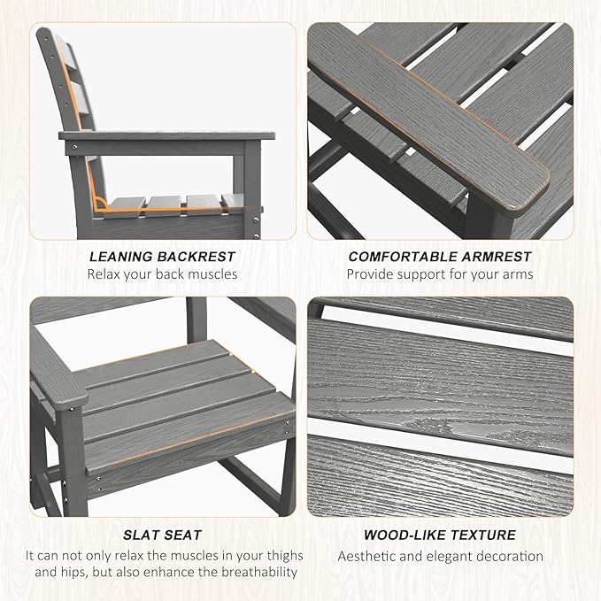 • 【All-Weather Material】Made of High-density polyethylene (HDPE) and 304 stainless steel hardware, this patio dining set is long-lasting and will not crack, scratch, rust, or fade over time. In addition, the table and chairs are designed with an elegant wood-like texture, combining both practicality and aesthetics.