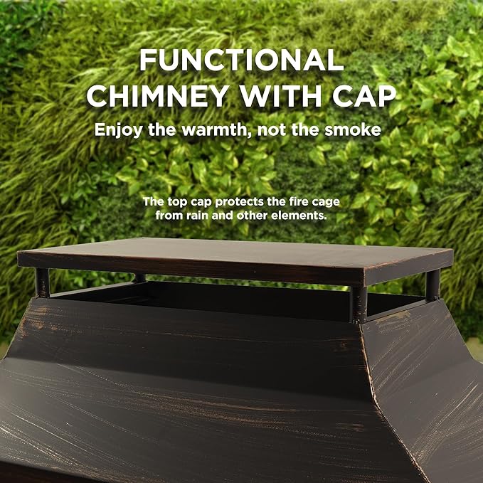 • Rain & Spark Protection: Our chiminea outdoor fireplace features a tower-style chimney with rain cover to shield flames, plus mesh screens to contain sparks. Enjoy safe wood burning in your fire pit without obstructing the beautiful fire view.