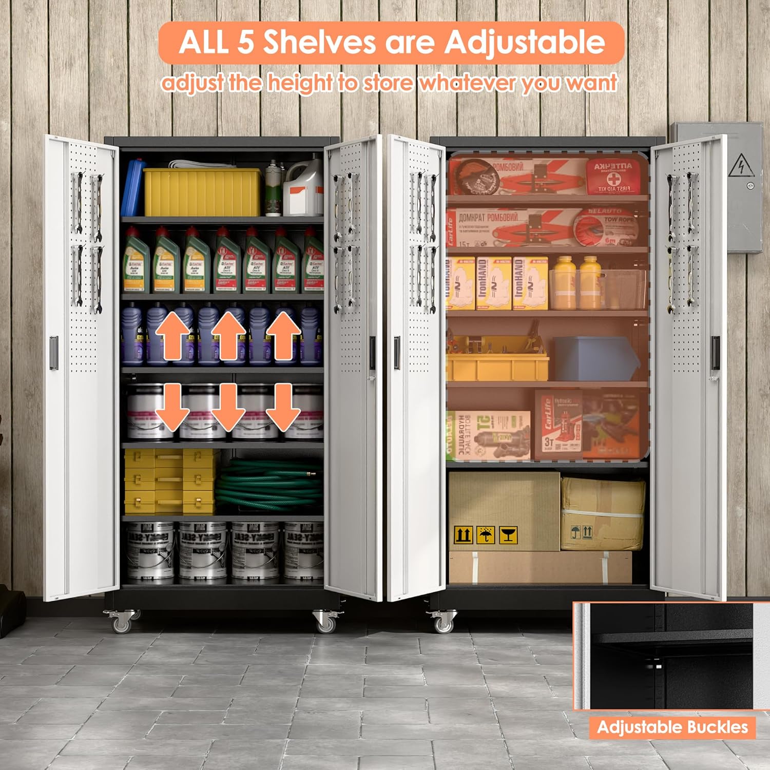 • Metal Storage Cabinet : 71"H metal storage cabinet has 5 adjustable and removable shelves that can be adjusted while ensuring maximum adaptability and convenience to meet your own unique storage and organization needs. Metal storage cabinet have 2 round pegboards and 4 hooks, and if you need more you can easily buy more suitable hooks
