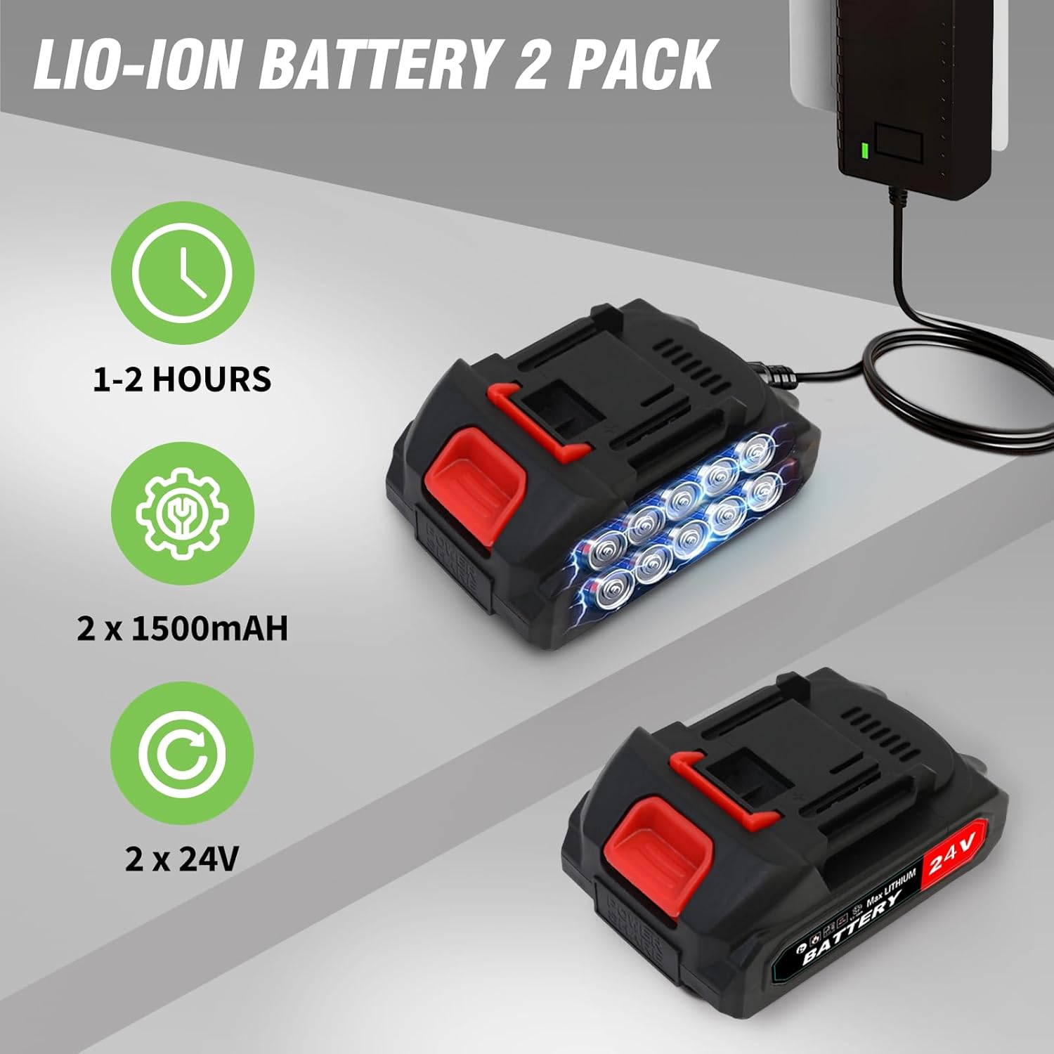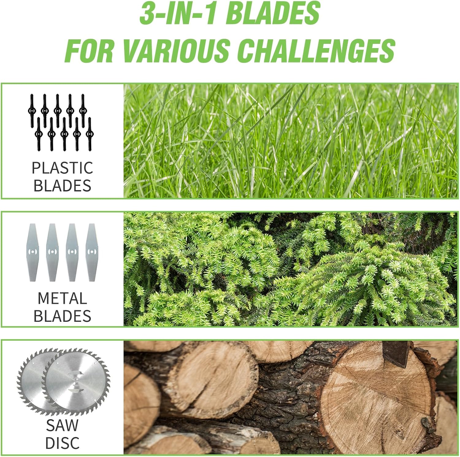 • Complete Kit with 2 Batteries & Accessories: Get everything you need in one box: 1 cordless weed wacker, 2 batteries, 2 round alloy saw blades, 10 plastic blades, 4 alloy blades, 2 wheels, 1 charger, plus 1 safety goggles and 1 pair of gloves for full protection. A ready-to-use electric weed trimmer set for hassle-free lawn care