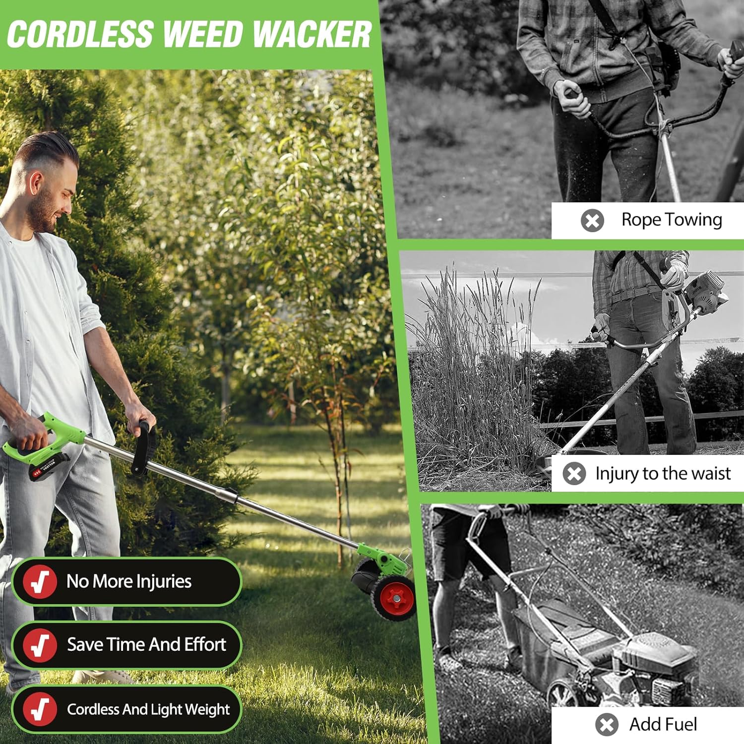 ALSO GO 21V Electric Weed Wacker, Weed Trimmer, Battery Powered Grass Trimmer with 2pcs Batteries, 3 in 1 Cordless Weed Eater with Wheels, Stringless Lightweight Grass Cutter for Lawn Garden Yard