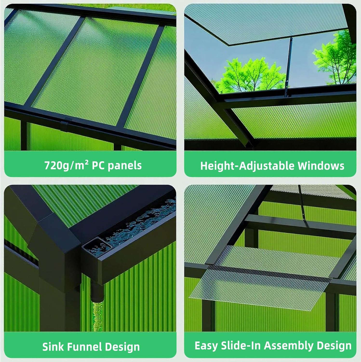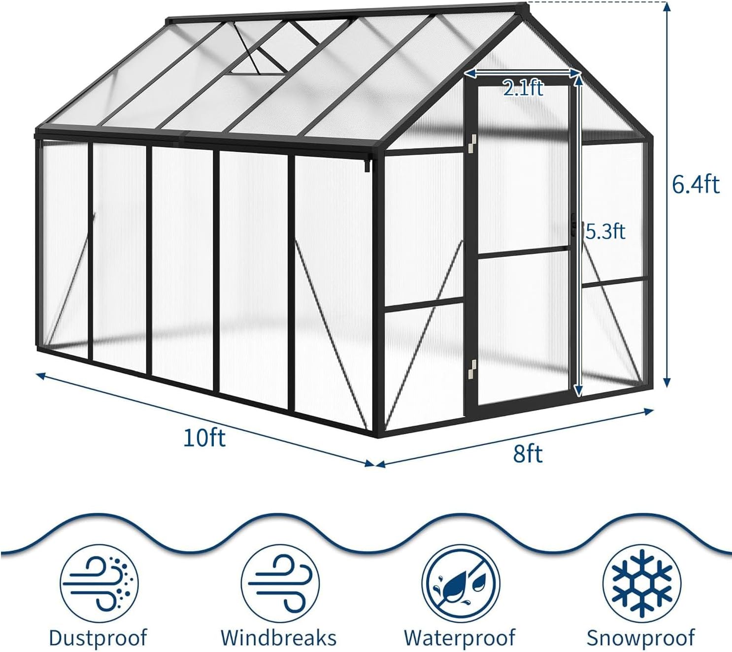 • Superior ventilation and spacious layout define this thoughtfully designed structure. Dual roof vents and a wide lockable door promote exceptional air circulation, while the generous 8x10FT interior accommodates multiple planting tiers, hanging baskets, and shelving units. This green houses for outside offers both vertical and horizontal space optimization for cultivating everything from seedlings to mature crops.
